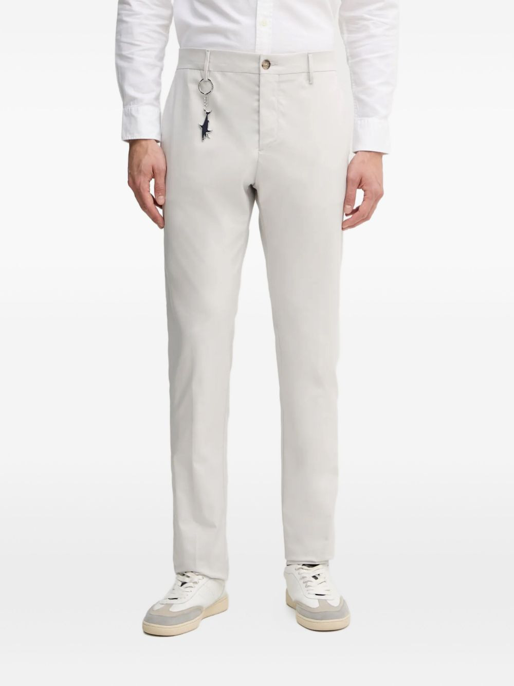 shark-charm trousers Highlights - Light grey - Shark charm - Button fastening - Belt loops - Rear button-fastening welt pocket - Side seam pockets Imported Composition Lyocell 77%, Cotton 20%, Elastane 3% SIZE & FIT FittingInformation Designed for a slim fit, offering a comfortable fit that sits just away from the leg Made from a midweight stretch fabric, this piece offers elasticity and flexibility when worn Washing instructions Read Manufacturer Guidelines