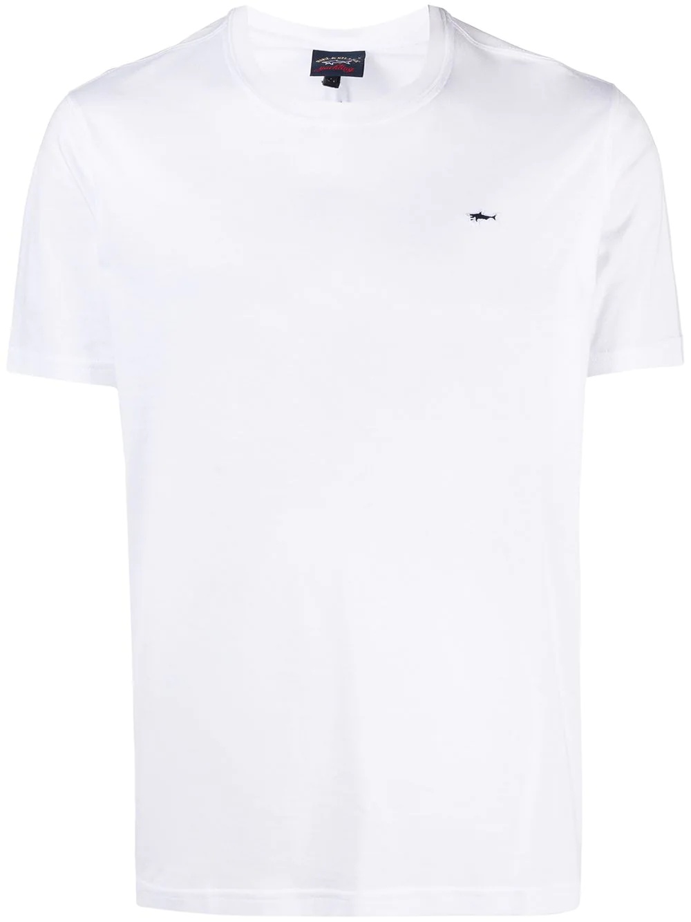 shark motif T-shirt white cotton round neck embroidered logo at the chest short sleeves straight hem Imported Composition Cotton 100% SIZE & FIT Model measurements Height 6 ft 1 in(1.85 m) Bust/Chest 35.82 in(91 cm) Hips 37.79 in(96 cm) Waist 29.13 in(74 cm) Washing instructions Machine Wash