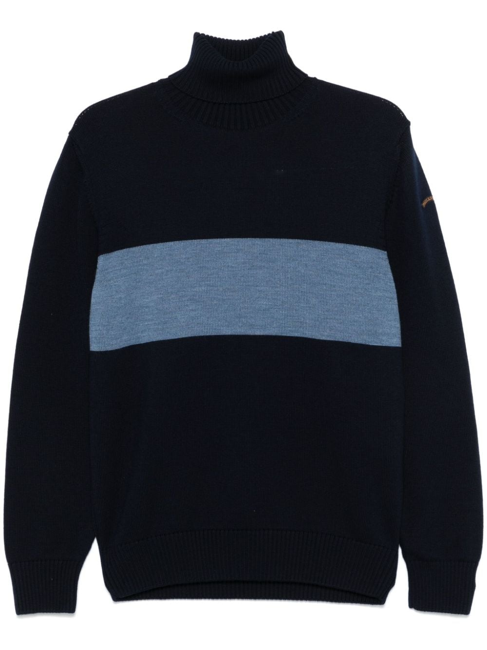 virgin wool sweater Highlights - Navy blue - Virgin wool - Knitted construction - Roll neck - Stripe detailing - Logo patch at the sleeve - Long sleeves - Ribbed cuffs and hem - Straight hem Imported Composition Virgin Wool 100%