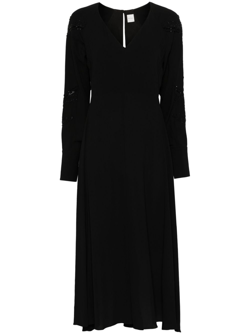beaded dress Highlights - Black - Crepe texture - Bead embellishment - Rear button fastening - V-neck - Long sleeves - Buttoned cuffs - Keyhole detail to the rear - Partial lining - Flared Imported Composition Lining: Polyester 100% Outer: Viscose 100% SIZE & FIT Model measurements Height 5 ft 11 in(1.8 m) Bust/Chest 33.07 in(84 cm) Hips 37.4 in(95 cm) Waist 25.19 in(64 cm) FittingInformation Designed for a close fit at the chest with a loose fit over the waist and hips Made from a midweight non-stretch fabric