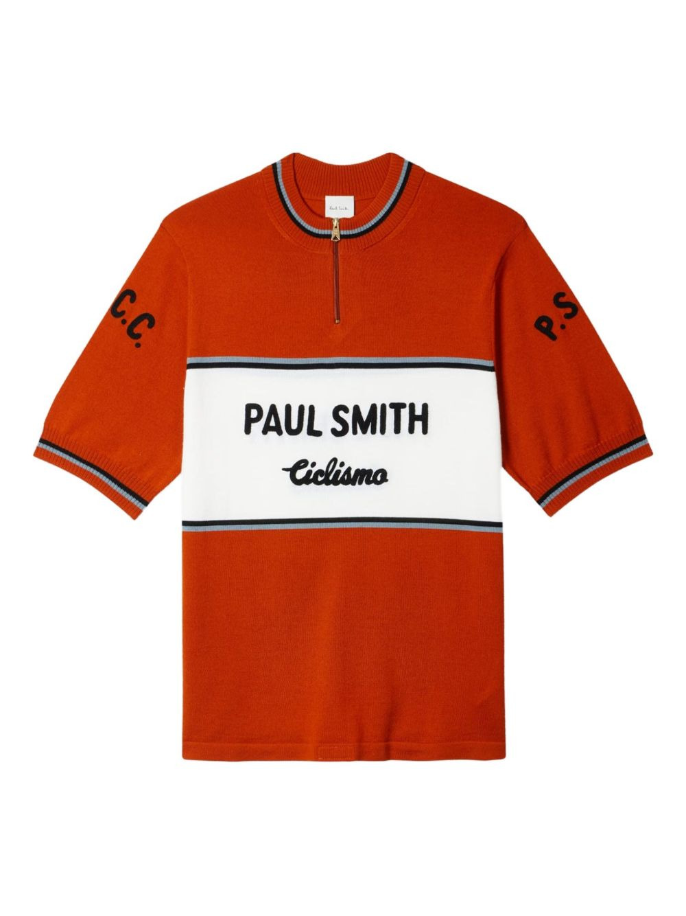 cycling-stripe wool sweater Highlights - Burnt orange - Short sleeves - Zip fastening - Embroidered lettering - Panelled design - Ribbed trims Made in Italy Composition Merino 100% Washing instructions Read Manufacturer Guidelines