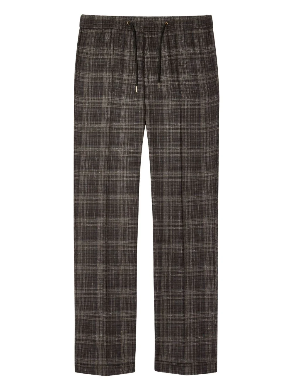 drawstring checked trousers Highlights - Brown - Checked pattern - Drawstring fastening - Buttoned back pocket - Elasticated waistband Imported Composition Silk 37%, Wool 33%, Linen/Flax 30% Washing instructions Read Manufacturer Guidelines