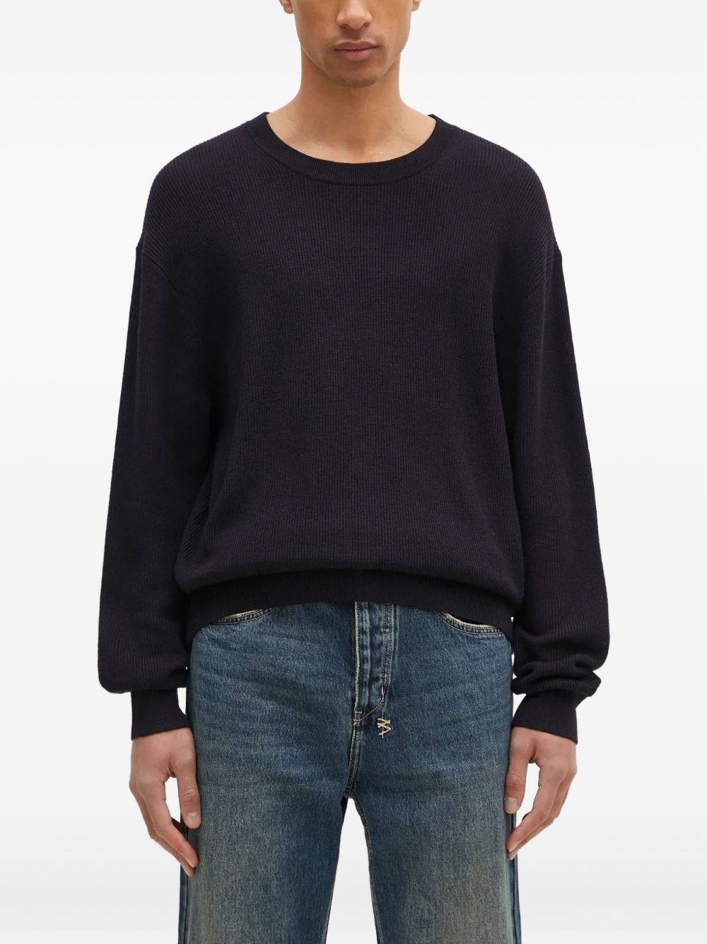 ribbed-knit crew-neck sweater Highlights - Dark blue - Ribbed knit - Crew neck - Long sleeves - Straight hem Imported Composition Merino 100% Washing instructions Read Manufacturer Guidelines