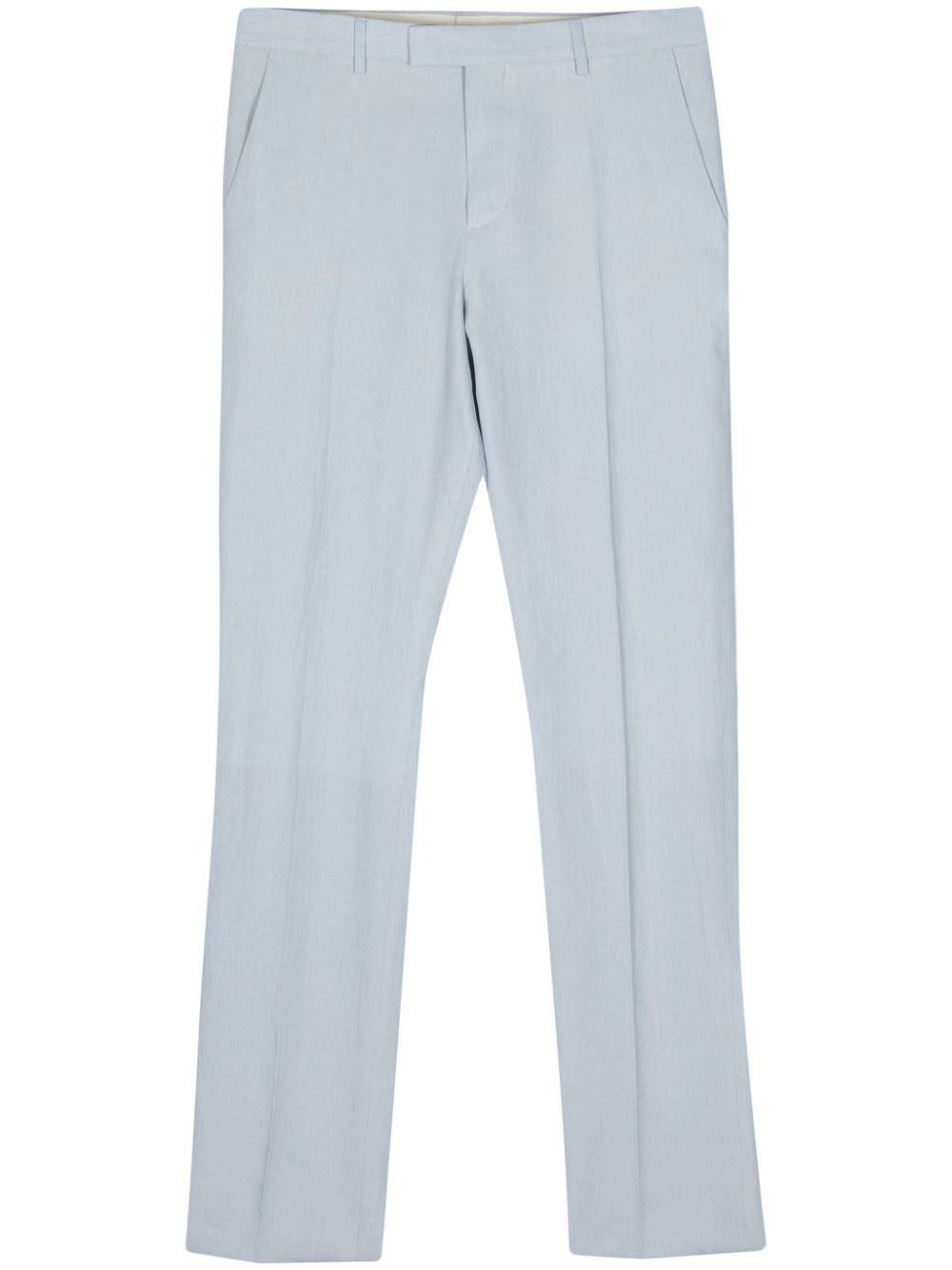 tailored linen trousers Highlights - Light blue - Linen/flax - Pleat detailing - Mid-rise - Concealed front fastening - Belt loops - Tailored cut - Two side slit pockets - Two rear welt pockets Imported Composition Linen/Flax 100% SIZE & FIT FittingInformation Designed for a slim tapered leg, offering a close fit that sits just away from the leg with a closer fit towards the ankle Made from a midweight non-stretch fabric, this piece offers minimal elasticity when worn