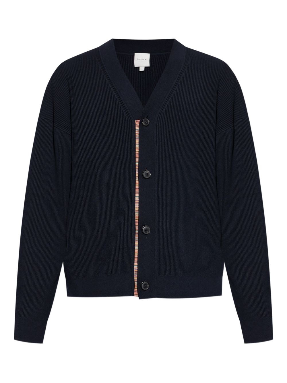 V-neck cardigan Highlights - Black - Front button fastening - Long sleeves - Striped border - Ribbed trim Imported Composition Wool 50%, Cotton 50%