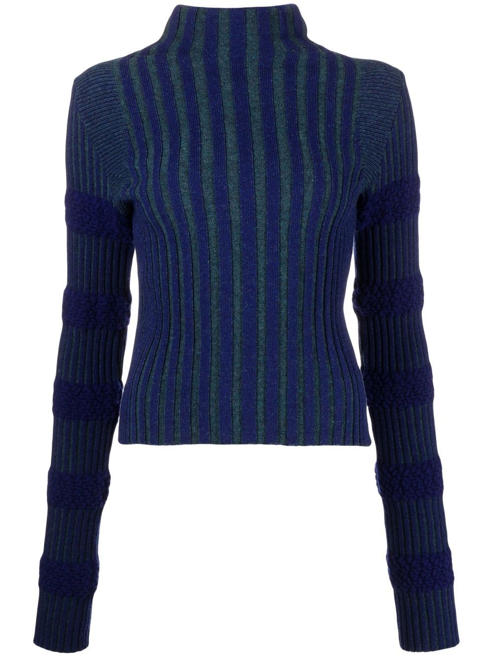 ribbed-knit long-sleeve jumper navy blue lambs wool ribbed knit high neck long sleeves slim cut Imported Composition Lambs Wool 100% SIZE & FIT Model measurements Height 5 ft 10 in(1.78 m) Bust/Chest 33.46 in(85 cm) Hips 35.43 in(90 cm) Waist 24.4 in(62 cm) FittingInformation This piece fits true to size. We recommend you get your regular size Cut for a slim fit Made with a mid-weight fabric