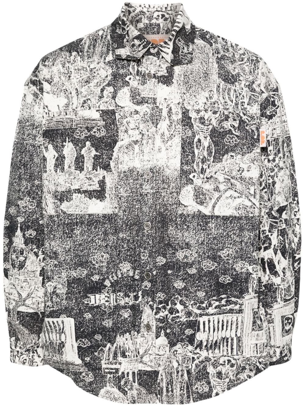AGW graphic-print shirt Highlights - Black/white - Textured finish - All-over graphic print - Spread collar - Long sleeves - Buttoned cuffs - Mini logo tag - Two chest patch pockets - Curved hem - Front button fastening Made in Italy Composition Polyester 86%, Elastane 14% SIZE & FIT Model measurements Height 6 ft 2 in(1.87 m) Bust/Chest 36.41 in(92.5 cm) Hips 37 in(94 cm) Waist 29.52 in(75 cm) FittingInformation Designed to be unstructured, offering a loose fit throughout Made from a midweight stretch fabric, this piece offers elasticity and flexibility when worn This piece fits true to size – take your usual size