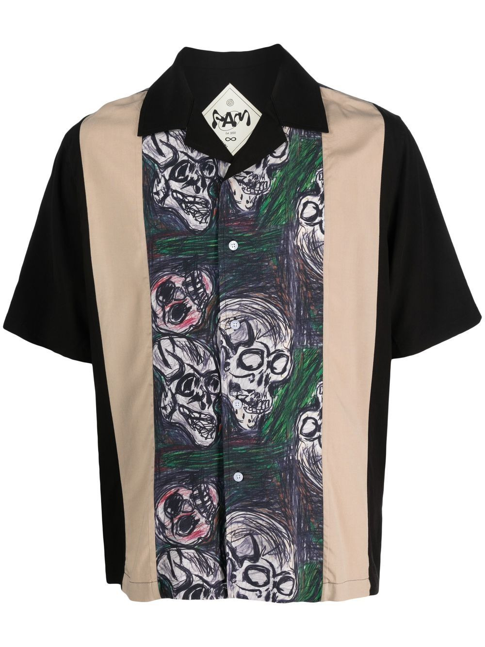 skull-print bowling shirt Highlights - Black/multicolour - Contrasting panel detail - Skull print - Camp collar - Front button fastening - Short sleeves - Straight hem Imported Composition Lyocell 100% SIZE & FIT Model measurements Height 6 ft 1 in(1.86 m) Bust/Chest 37.4 in(95 cm) Hips 34.64 in(88 cm) Waist 29.13 in(74 cm) FittingInformation This piece fits true to size. We recommend you get your regular size Cut for a relaxed fit Made with a mid-weight non-stretch fabric Washing instructions Hand Wash