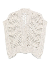 sequin-embellished open-knit cardigan Highlights - Off-white - Open knit - Sequin embellishments - Sleeveless - V-neck - Straight hem Made in Italy Composition Alpaca Wool 60%, Polyester 38%, Polyamide 2% SIZE & FIT Model measurements Height 5 ft 10 in(1.79 m) Bust/Chest 31.88 in(81 cm) Hips 35.43 in(90 cm) Waist 23.62 in(60 cm) Washing instructions Machine Wash
