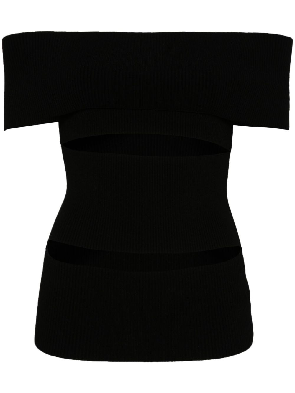 cut-out top Highlights - Black - Ribbed knit - Cut-out detailing - Square neck - Off-shoulder - Short sleeves - Straight hem Made in Italy Composition Viscose 72%, Polyester 28% SIZE & FIT Model measurements Height 5 ft 10 in(1.78 m) Bust/Chest 33.85 in(86 cm) Hips 36.61 in(93 cm) Waist 26.77 in(68 cm) FittingInformation Designed for a close fit throughout Made from a midweight non-stretch fabric, this piece offers minimal elasticity when worn This piece fits true to size – take your usual size