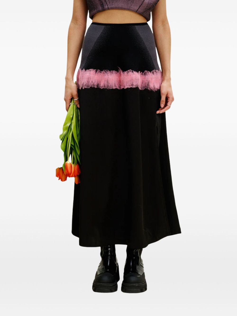 needle-punch ruffled skirt Highlights - Black - Needle-punch texture - Pink ruffle - Side split - A-line shape Imported Composition Recycled Viscose 83%, Polyester 17% Washing instructions Read Manufacturer Guidelines
