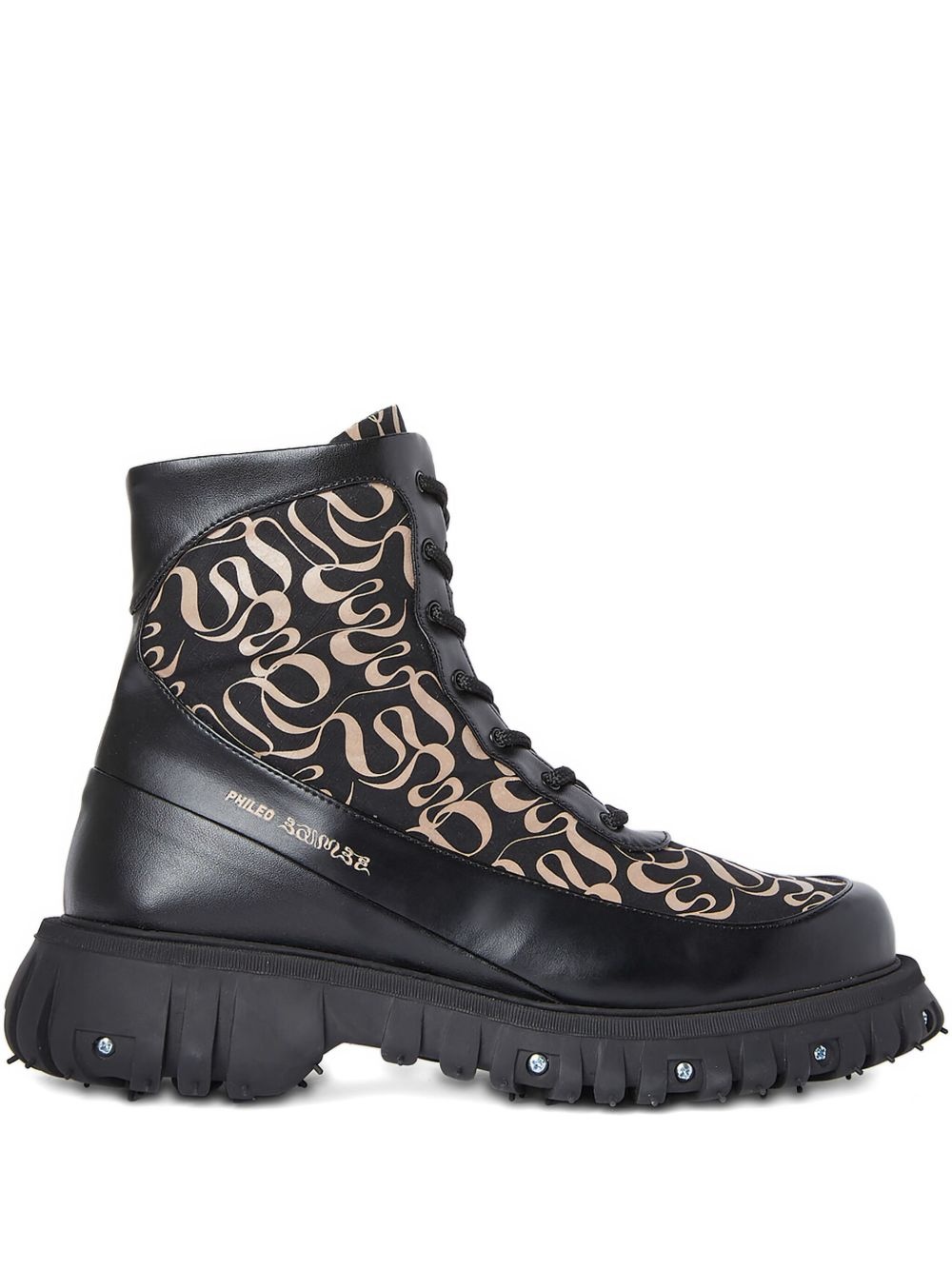 monogram-pattern boots Highlights - Black - Front lace-up fastening - Ridged rubber sole - Branded insole - Round toe Imported Composition Sole: Rubber 100% Outer: Cotton 50%, Artificial Leather 40%, Recycled Mesh 10% Lining: Fabric 100%