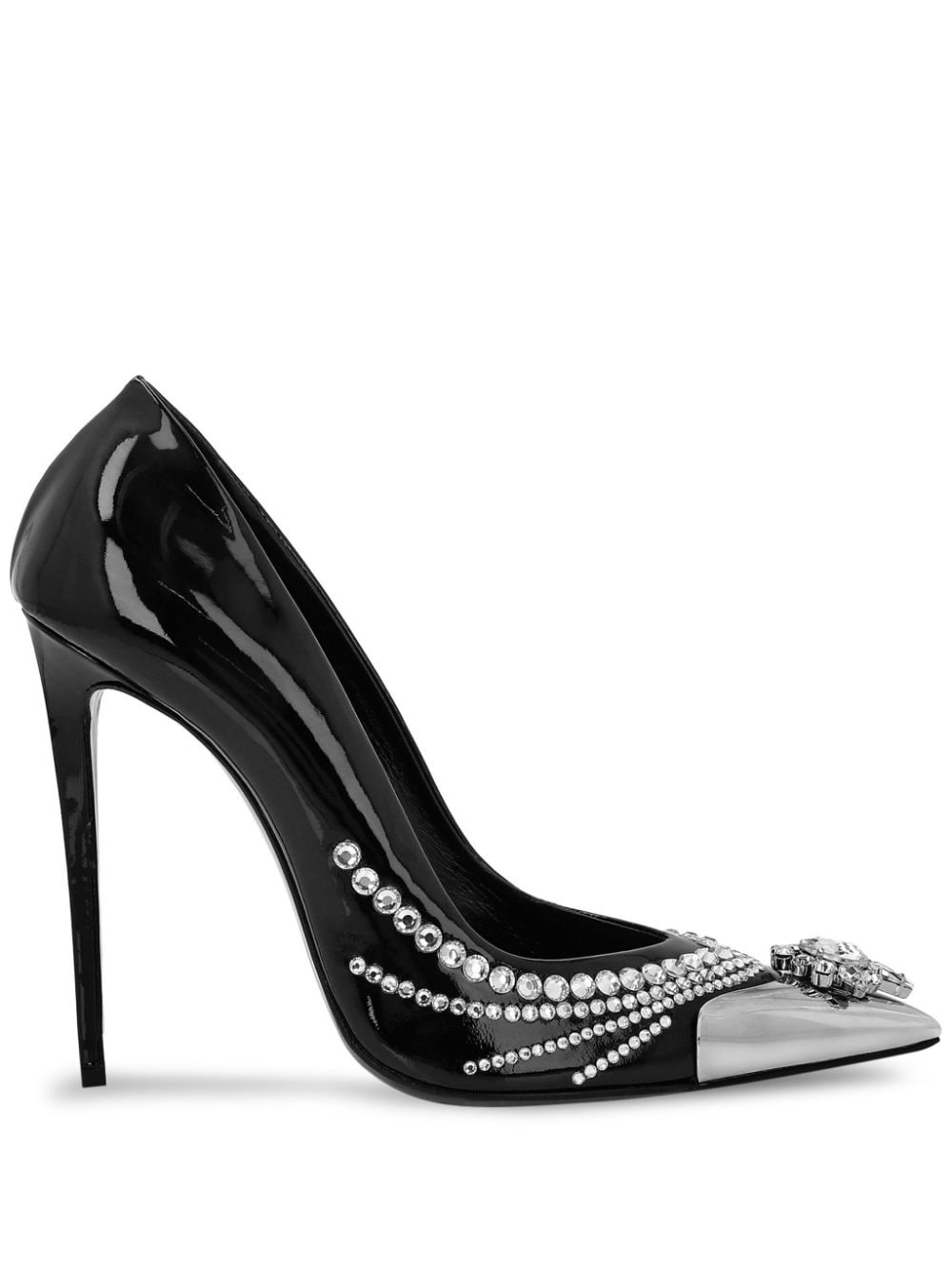 105mm crystal-embellished patent leather pumps Highlights - Black - Calf leather - Patent finish - Crystal embellishment - Pointed toe - Metal toecap - Silver-tone hardware - Slip-on style - Leopard print lining - Branded insole - 105mm high stiletto heel - Leather sole Made in Italy Composition Sole: Calf Leather 100% Lining: Calf Leather 100% Outer: Patent Calf Leather 100%