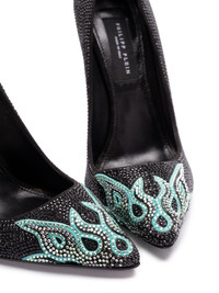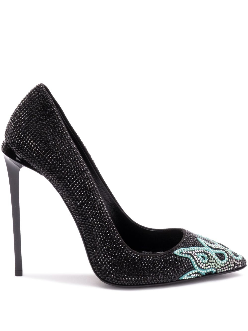 120mm flame-embellished pumps Highlights - Black - Pointed toe - Glass crystal embellishment - Slender stiletto heel - Textured upper - Cushioned insole - Sleek silhouette - Elegant design Made in Italy Composition Outer: Goat Skin 100%, glass 100% Lining: Lamb Skin 100% Sole: Calf Leather 100% SIZE & FIT Measurement HEEL 4.72 in(12 cm)