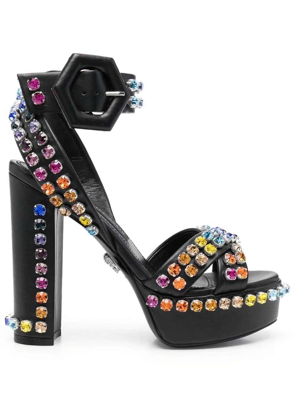 135mm crystal-embellished platform sandals black/multicolour leather crystal embellishment buckle-fastening ankle strap open toe platform sole high block heel Made in Italy Composition Outer: Leather 100% Lining: Leather 100% Sole: Leather 100% SIZE & FIT Measurement HEEL 5.15 in(13.1 cm) PLATFORM 1.77 in(4.5 cm)