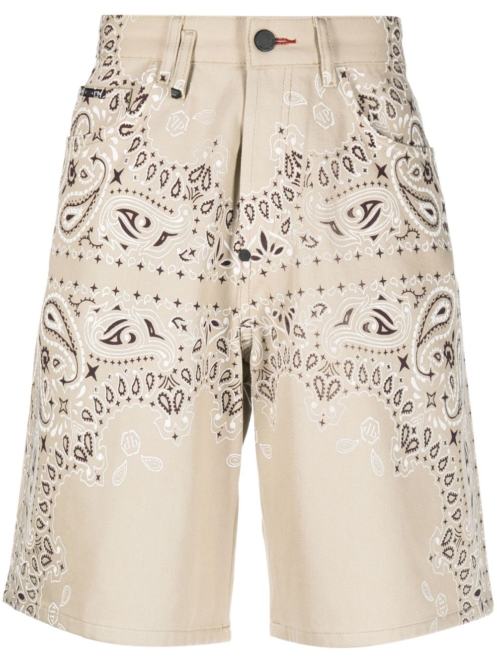 bandana-print denim shorts Highlights - Light beige - White/black - Cotton blend - Bandana print - Logo patch to the rear - Front button and zip fastening - Classic five pockets - Belt loops - Straight leg Imported Composition Outer: Cotton 100% Lining: Polyester 65%, Cotton 35% SIZE & FIT Model measurements Height 6 ft 1 in(1.85 m) Bust/Chest 35.82 in(91 cm) Hips 37.79 in(96 cm) Waist 29.13 in(74 cm) FittingInformation Designed with a wide leg, offering a loose and roomy fit Sturdy and hard-wearing, this denim piece offers no stretch This piece fits true to size – take your usual size Washing instructions Do Not Wash/Do Not Dry Clean