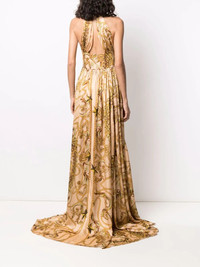 baroque-print halterneck dress beige silk baroque-pattern print halterneck plunging V-neck sleeveless full-length Imported Composition Silk 100% SIZE & FIT Model measurements Height 5 ft 10 in(1.79 m) Bust/Chest 33.07 in(84 cm) Hips 35.82 in(91 cm) Waist 24.01 in(61 cm) FittingInformation This piece fits true to size. We recommend you get your regular size Designed for a close fit at the bust and waist, but loose at the hip Made with a mid-weight fabric Washing instructions Dry Clean Only