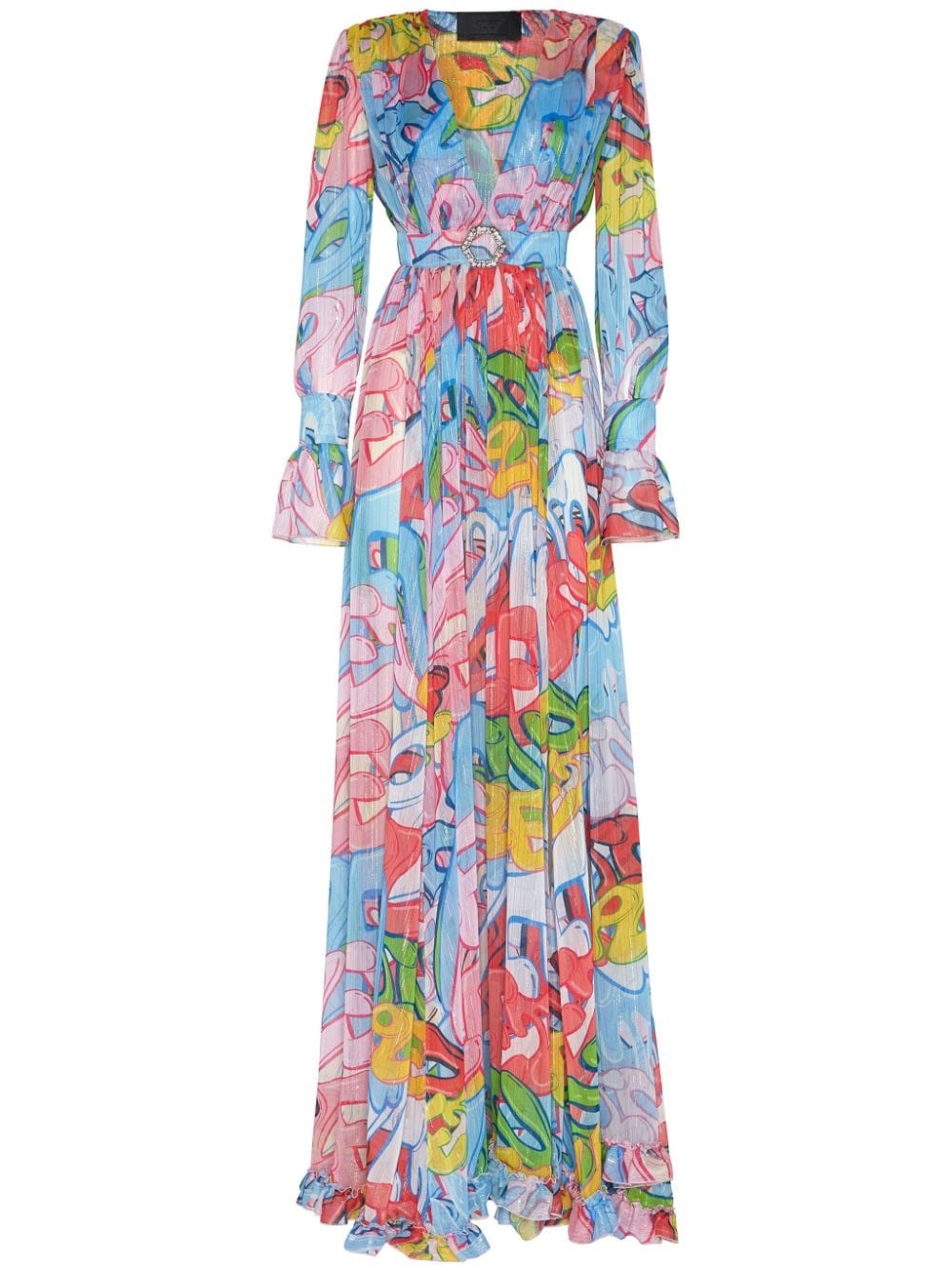 Bombing Graffiti-print maxi dress Highlights - Multicolour - Chiffon - All-over graphic print - Gathered detailing - Crystal embellishment - V-neck - Long sleeves - Flared cuffs - Side slit - Long length - Straight hem Made in Italy Composition Outer: Silk 97%, Elastane 22%, Polyester 3% Lining: Polyester 78%