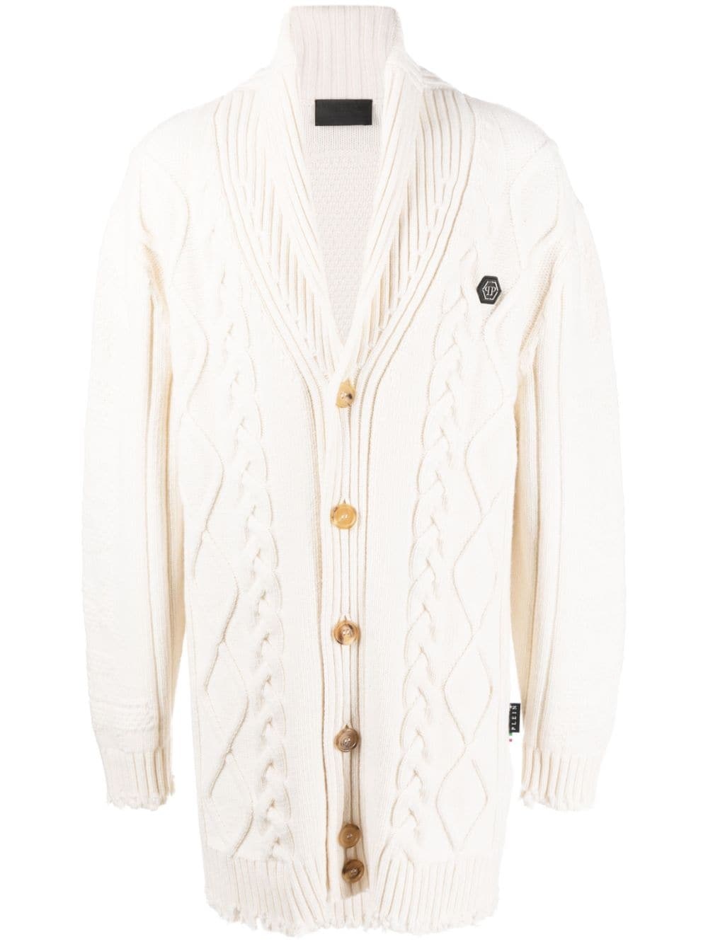 cable-knit distressed-finish cardigan Highlights - Off-white - Lambs wool - Cable knit - Knitted construction - Distressed finish - Logo patch at the chest - V-neck - Front button fastening - Long sleeves - Ribbed cuffs and hem Made in Italy Composition Lambs Wool 100% SIZE & FIT Model measurements Height 6 ft 0 in(1.84 m) Bust/Chest 35.82 in(91 cm) Hips 37 in(94 cm) Waist 28.34 in(72 cm) FittingInformation Designed to be unstructured, offering a loose fit throughout Made with a midweight knit, this piece offers some stretch This piece fits true to size – take your usual size Washing instructions Dry Clean Only