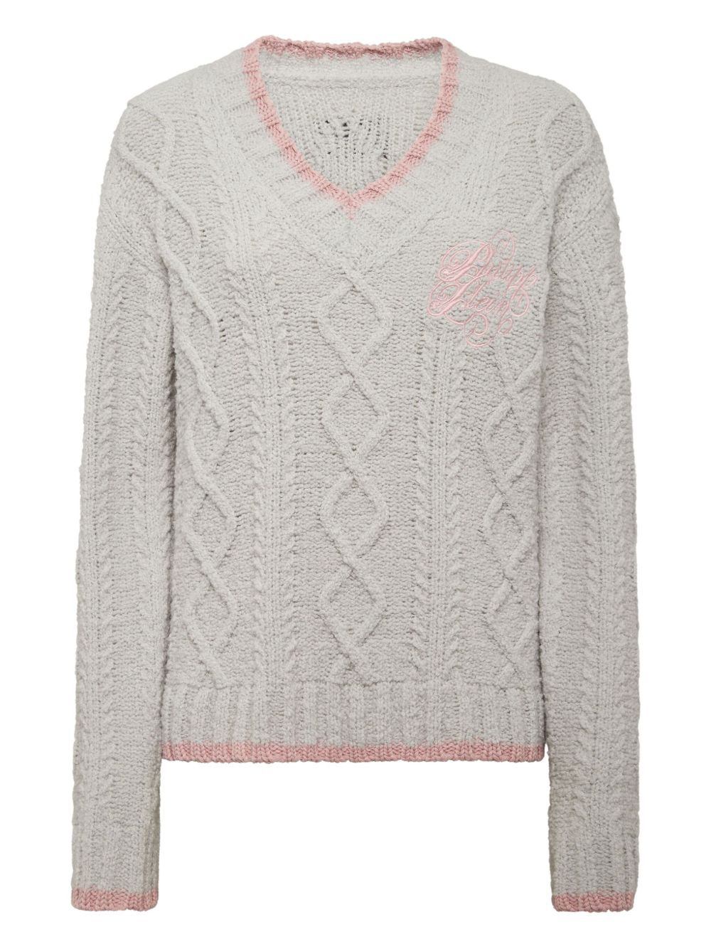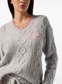 cable-knit v-neck sweater Highlights - Grey - Cable knit - V-neck - Embroidered logo - Long sleeves Made in Italy Composition Wool 81%, Polyamide 12%, Acrylic 7% Washing instructions Read Manufacturer Guidelines