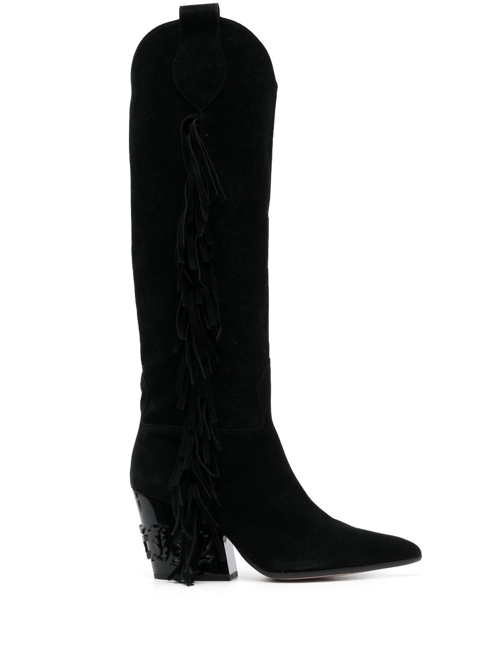 calf-leather cowboy boots Highlights - Black - Calf leather - Fringe detailing - Embossed logo to the rear - Double pull-tab at the opening - Pointed toe - Short side zip fastening - Calf-length - High block heel - Branded insole Made in Italy Composition Suede 100% SIZE & FIT Measurement CIRCUMFERENCE 13.38 in(34 cm) HEEL 2.36 in(6 cm) HEIGHT 16.14 in(41 cm) Sole height 0.39 in(1 cm)