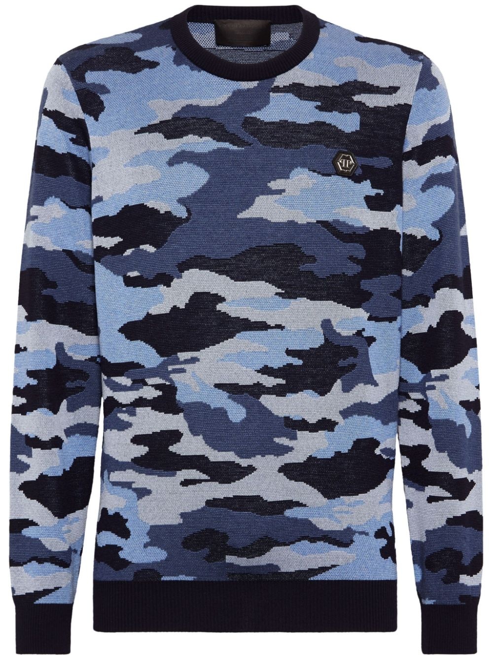 camouflage-pattern merino jumper Highlights - Navy blue/black - Merino wool - Patterned intarsia knit - Intarsia-knit logo - Ribbed-knit edge - Camouflage pattern - Crew neck - Long sleeves - Straight hem Made in Italy Composition Merino 100%