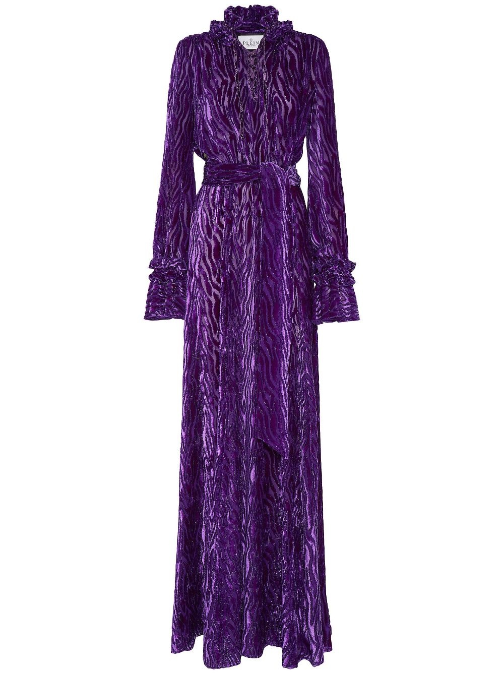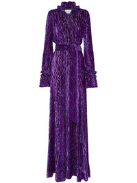 Chiffon Gipsy devore-effect dress Highlights - Amethyst purple - Devore effect - Frilled high neck - Long sleeves - Ruffle cuffs - Belted waist - Front tie fastening - Extra-long length Made in Italy Composition Viscose 61%, Silk 24%, Nylon 15%