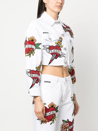 cropped Love denim jacket cloud white cotton cropped crystal embellishment heart print classic collar front button fastening long sleeves two chest flap pockets Imported Composition Outer: Cotton 100% Lining: Polyester 65%, Cotton 35% SIZE & FIT Model measurements Height 5 ft 11 in(1.8 m) Bust/Chest 33.07 in(84 cm) Hips 37.4 in(95 cm) Waist 25.19 in(64 cm) FittingInformation This piece fits true to size. We recommend you get your regular size Cut for a slim fit Made with a mid-weight non-stretch fabric