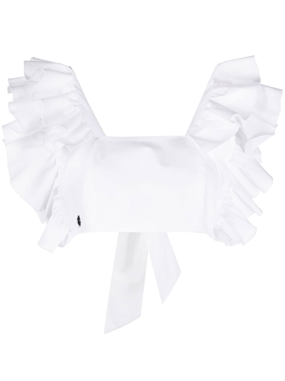 cropped ruffle-trimmed top cloud white cotton cropped ruffle detailing round neck sleeveless Made in Italy Composition Cotton 100% SIZE & FIT Model measurements Height 5 ft 11 in(1.8 m) Bust/Chest 33.07 in(84 cm) Hips 37.4 in(95 cm) Waist 25.19 in(64 cm) FittingInformation Designed for a close fit throughout The tie fastening gives an adaptable and personalised fit Made from a midweight non-stretch fabric This piece fits true to size – take your usual size Washing instructions Hand Wash