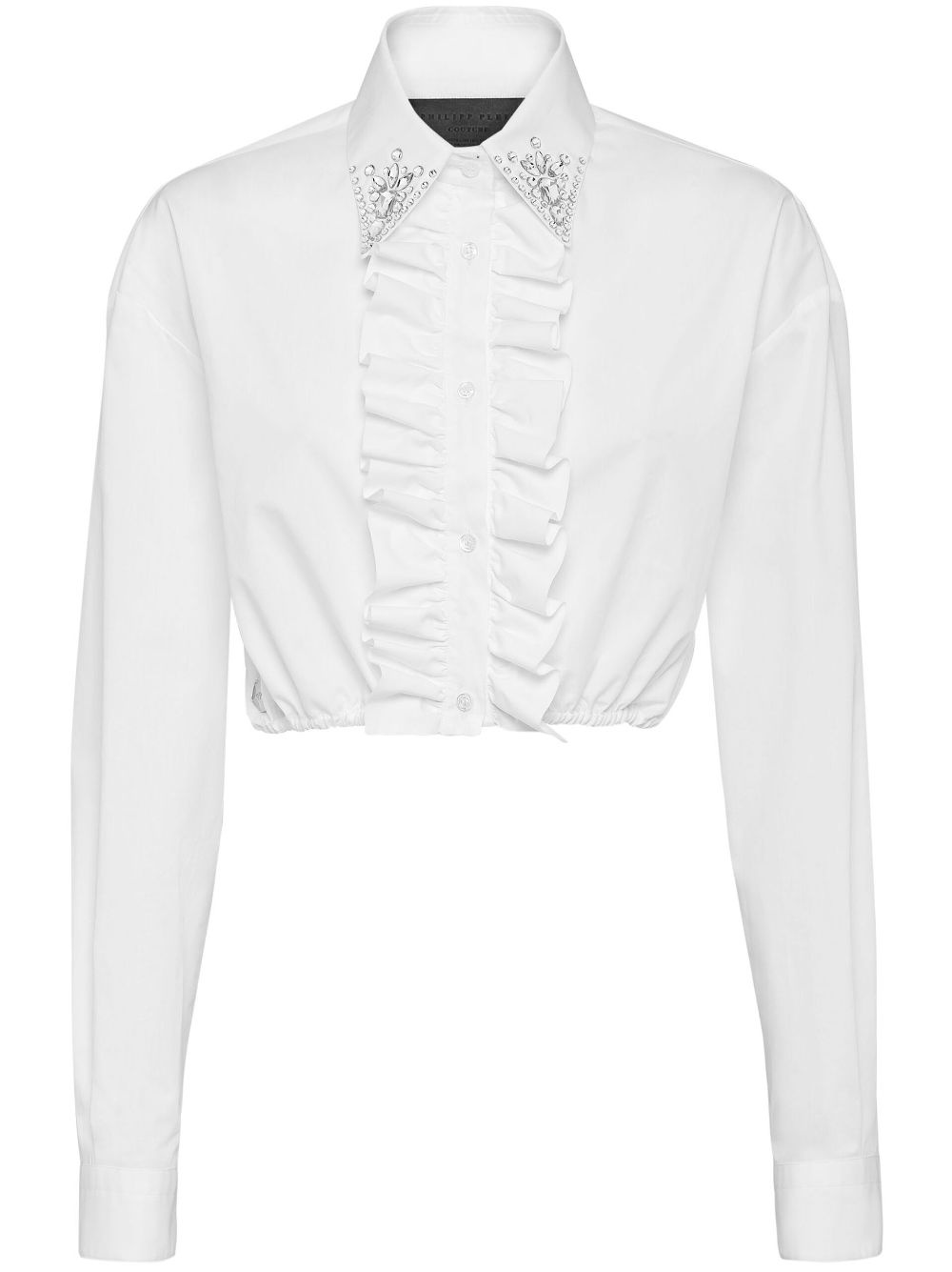 cropped ruffled cotton shirt Highlights - White - Ruffled detailing - Cropped - Long sleeves - Elasticated hem - Front button fastening - Crystal embellishment Made in Italy Composition Cotton 100%