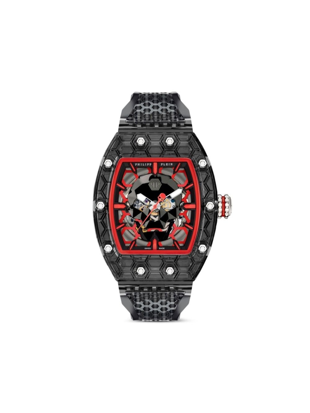 Crypto King CRY$TAL GHOST 55mm Highlights - 55 x 45 mm - Black/red - Stainless steel - Tonneau face - Translucent design - Skeleton dial - Baton dial - Baton hands - Skull applique - Automatic movement - Screw-down crown - Stainless steel perforated bracelet - Pin-buckle fastening - 40-hour power reserve - This item comes with a standard one-year warranty from the brand. Imported Composition Polyurethane 100%, Polycarbonite 100%, stainless steel 100% SIZE & FIT Measurement DIAMETER 2.4 in(6.1 cm) Minimum Length 7.28 in(18.5 cm) Thickness 0.66 in(1.7 cm) TOTAL LENGTH 9.05 in(23 cm) WIDTH 1.1 in(2.8 cm)