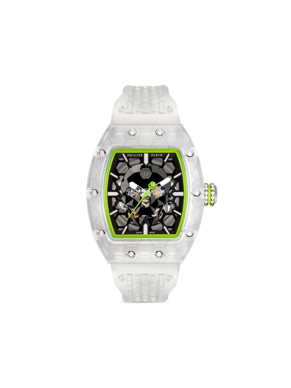 Crypto King Fro$t Glacier 55mm Highlights - 45mm x 55mm - Stainless steel - Self-winding movement - Tonneau face - Skeleton dial - Baton hands - Screw-down crown - Transparent strap - Tang-buckle fastening - This item comes with a standard two-year warranty from the brand. Imported Composition Polyurethane 100%, Polycarbonite 100%, stainless steel 100% SIZE & FIT Measurement HEIGHT 2.16 in(5.5 cm) WIDTH 1.77 in(4.5 cm)