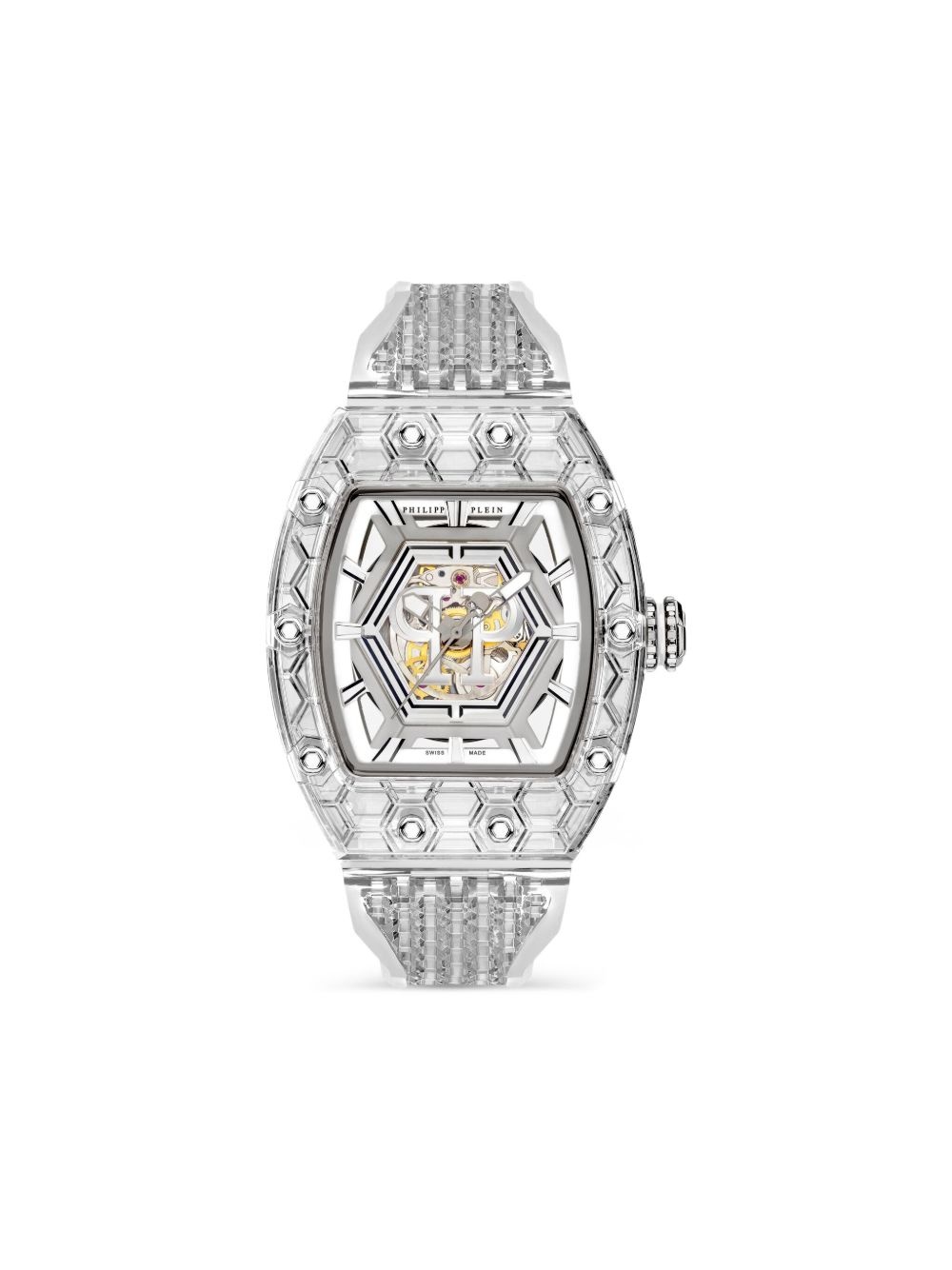 Crypto King Hexagon Ice Breaker 55mm Highlights - 55 x 45 mm - Automatic movement - Tonneau face - Baton dial - Baton hands - Sapphire-crystal glass - Anti-reflective coating - Screw-down crown - Stainless steel detailing - Transparent strap - Your purchase will arrive with a gift box. Imported Composition stainless steel 100%, Polycarbonite 100%, Polyurethane 100%