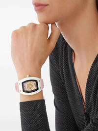 Crypto Queen CHERRY BLOSSOM ICE QUEEN 55mm Highlights - 55 x 45 mm - White/pink - Ceramic - Tonneau face - Skeleton dial - Diamond dial - Baton hands - Applique logo - Automatic movement - Screw-down crown - Logo-embossed strap - Pin-buckle fastening - This item comes with a standard one-year warranty from the brand. - Normal everyday use and external agents may reduce the lustre of gemstones and gold surfaces. to maintain, use specific, non-abrasive products specially meant for cleaning jewellery. Imported SIZE & FIT Measurement DIAMETER 2.4 in(6.1 cm) Minimum Length 7.28 in(18.5 cm) Thickness 0.66 in(1.7 cm) TOTAL LENGTH 9.05 in(23 cm) WIDTH 1.1 in(2.8 cm)