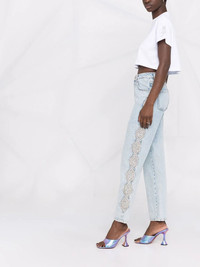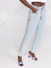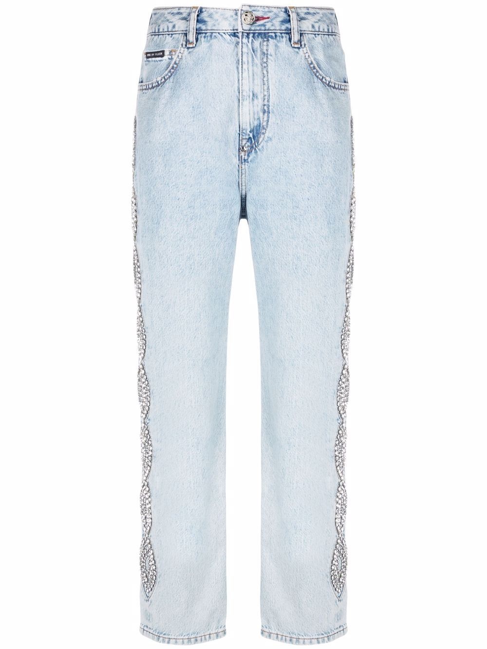 crystal cable jeans Philipp Plein presents these boyfriend jeans for SS22. Crafted in cotton, this pair draw the eye with their crystal cable detailing that encaspulates the house's signature rhinestone embellishment. Highlights - Pale blue - Cotton - Crystal embellishment - Classic five pockets - Boyfriend cut Imported Composition Outer: Cotton 100% Lining: Polyester 65%, Cotton 35% SIZE & FIT Model measurements Height 5 ft 10 in(1.77 m) Bust/Chest 32.28 in(82 cm) Hips 35.03 in(89 cm) Waist 25.19 in(64 cm) FittingInformation This piece fits true to size. We recommend you get your regular size Designed to be fitted at the waist and hips, loose over the leg Made with a mid-weight non-stretch fabric Washing instructions Dry Clean Only