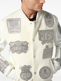Crystal College bomber jacket Highlights - White - Panelled design - Crystal embellishment - Front press-stud fastening - Ribbed band collar - Patch detailing - Long leather sleeves - Two side welt pockets - Ribbed cuffs and hem Imported Composition Outer: Calf Leather 100%, Polyester 64%, Viscose 33%, Elastane 3% Lining: Polyester 98%, Elastane 2%