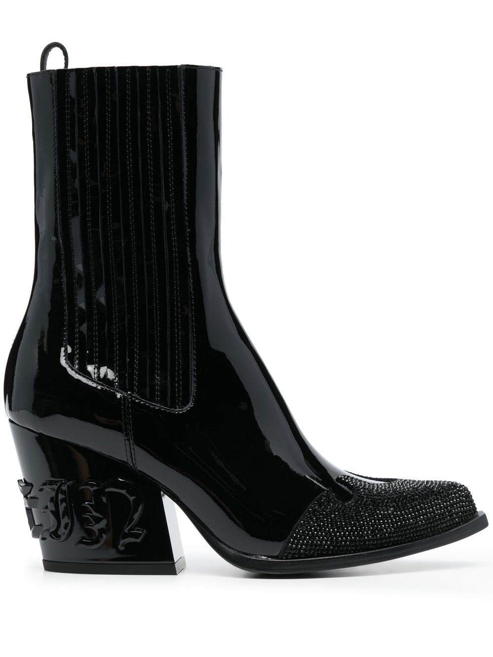 crystal-embellished boots black calf leather glossy finish crystal embellishment debossed logo to the rear pointed toe pull-tab at the heel mid block heel Made in Italy Composition Outer: Calf Leather 100% Lining: Calf Leather 100% Sole: Calf Leather 100% SIZE & FIT Measurement HEEL 3.14 in(8 cm) HEIGHT 7.08 in(18 cm) Sole height 0.59 in(1.5 cm)
