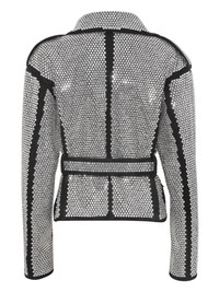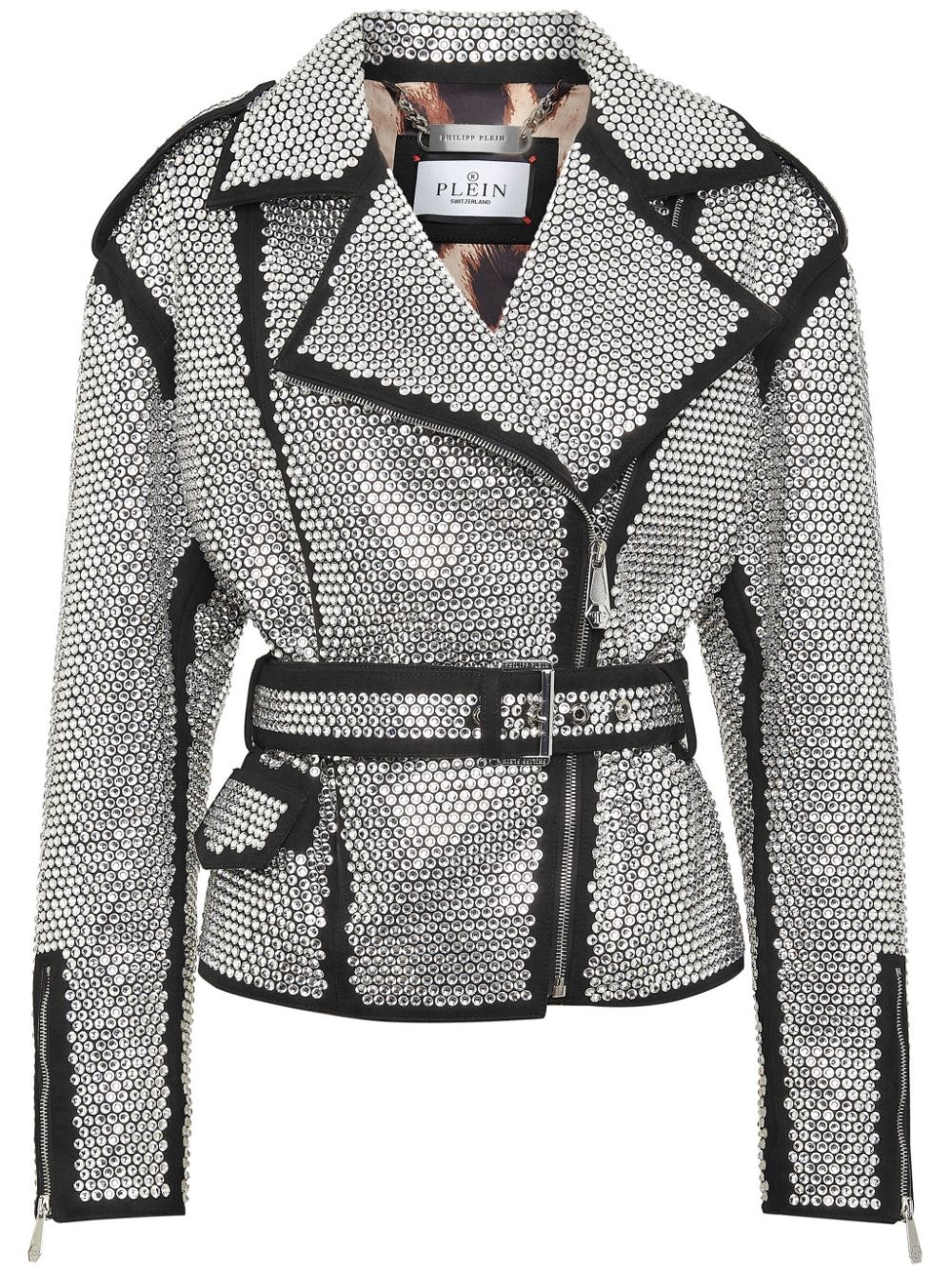 crystal-embellished jacket Highlights - Black/silver-tone - Crystal embellishment - Spread collar - Off-centre front zip fastening - Epaulettes - Drop shoulder - Long sleeves with cuff zips - Belt loops - Belted waist - Side flap pocket - Curved hem Imported Composition Polyester 50%, Polyurethane 50%