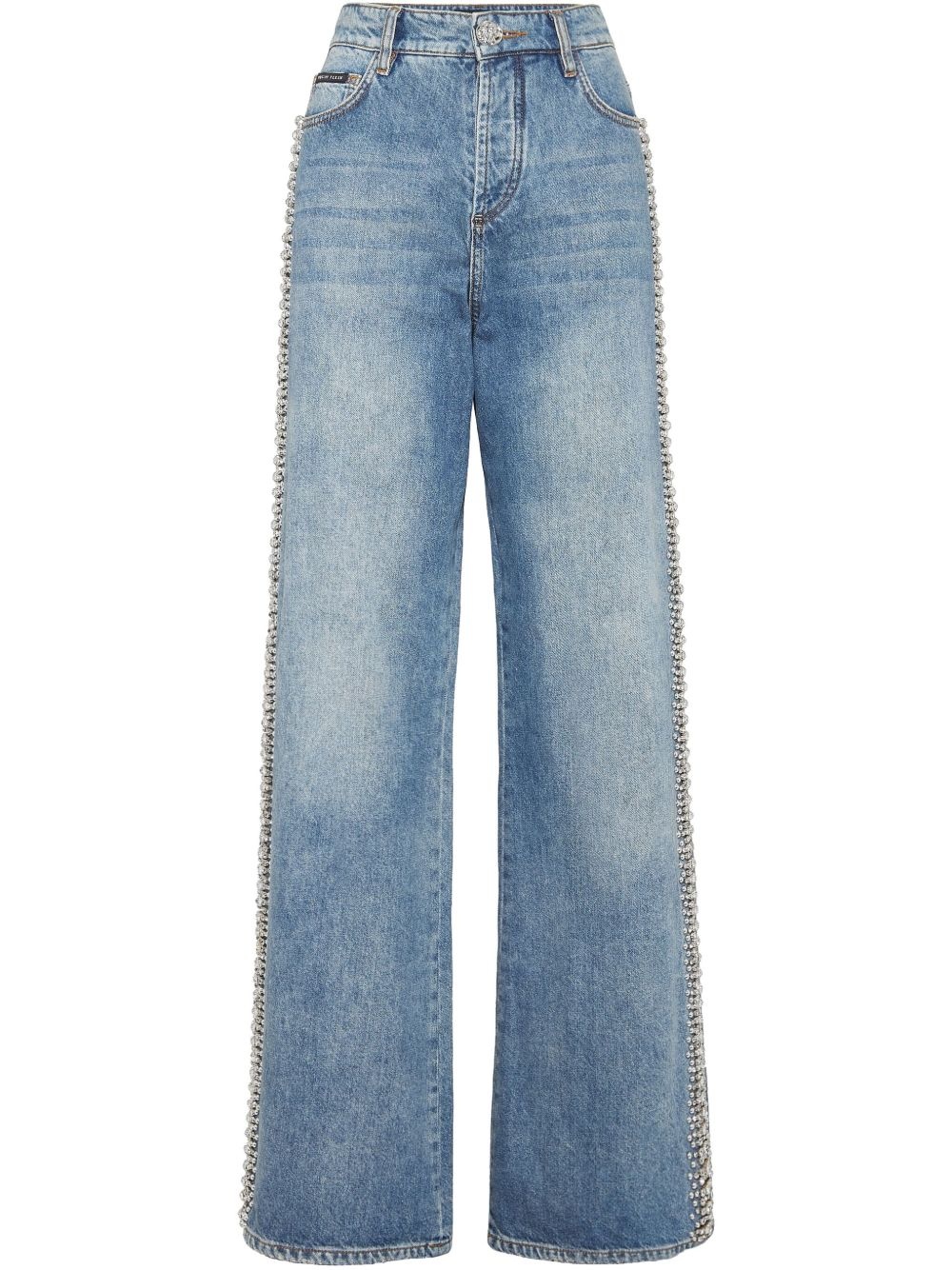 crystal-embellished jeans Highlights - Light blue - Concealed front fastening - Belt loops - Classic five pockets - Logo patch to the rear Imported Composition Outer: Cotton 100%, glass 100%, Metal 100% Lining: Polyester 65%, Cotton 35%