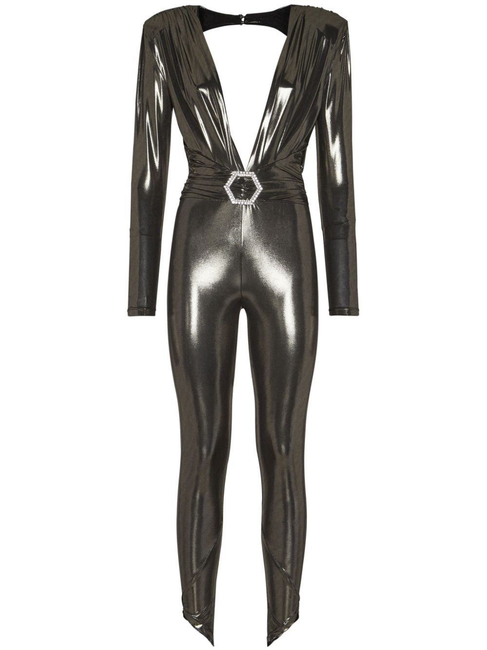 crystal-embellished lame jumpsuit Highlights - Anthracite grey - Lame - Crystal-embellished logo plaque - Plunging v-neck - Long sleeves - Open back - Rear button fastening Imported Composition Polyester 95%, Elastane 5%