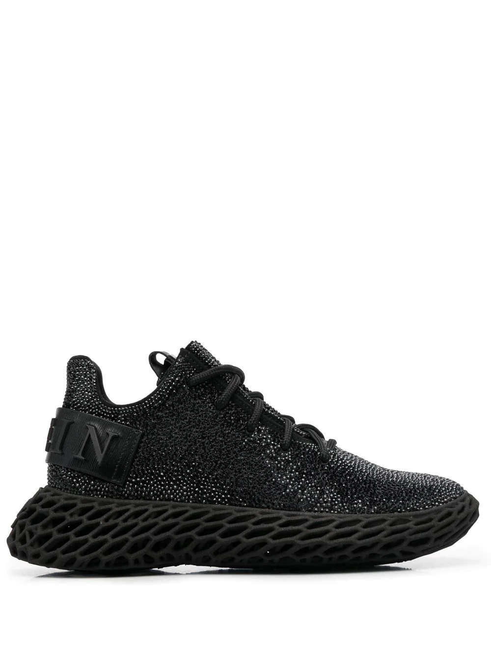 crystal-embellished leather sneakers black glass/leather embossed logo to the rear front lace-up fastening logo patch at the tongue round toe branded insole 3D print polyurethane sole Made in Italy Composition Leather 100% SIZE & FIT Measurement HEEL 2.16 in(5.5 cm) Sole height 0.98 in(2.5 cm)