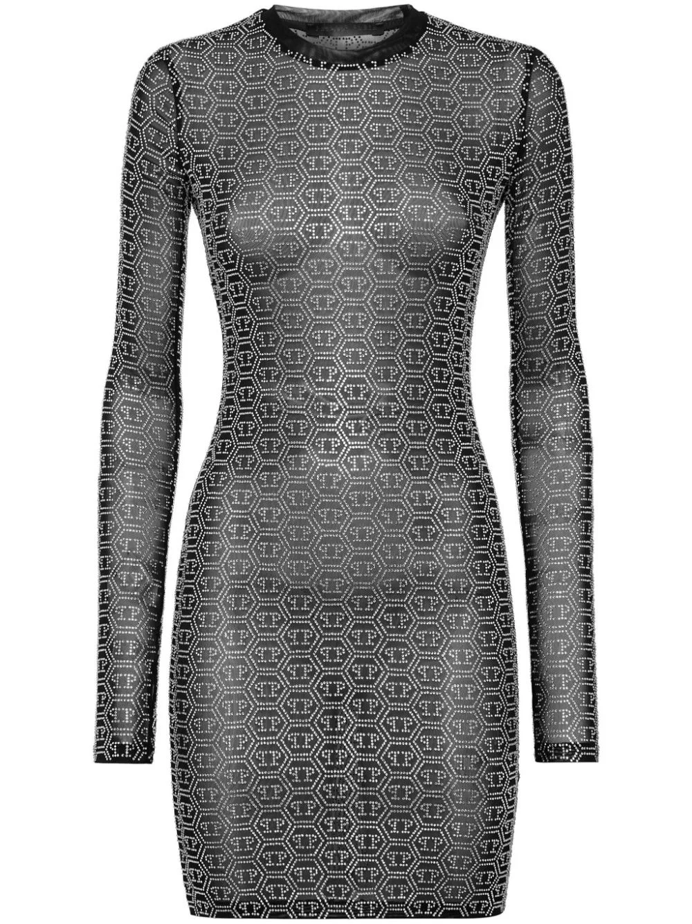 crystal-embellished mesh dress Highlights - Black - Stretch-design - Mesh design - Semi-sheer construction - Crystal embellishment - Crew neck - Long sleeves - Thigh-length - Straight hem Imported Composition Glass Fiber 100%, Polyester 66%, Elastane 34%
