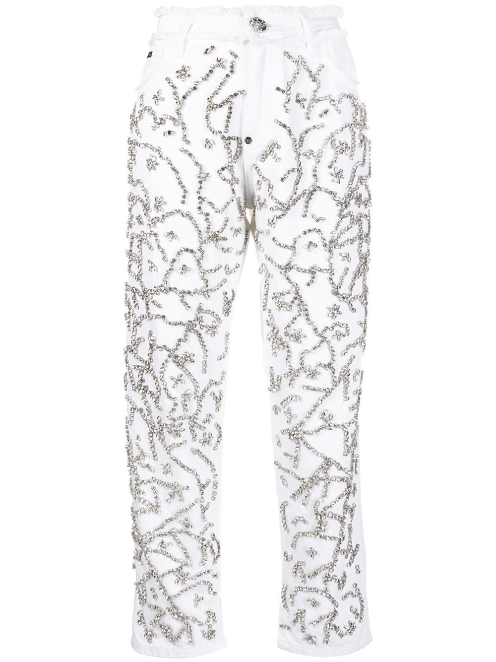 crystal-embellished mom-cut leg jeans cloud white cotton straight leg raw-cut edge crystal embellishment belt loops front button and zip fastening classic five pockets Imported Composition Outer: Cotton 100% Lining: Polyester 65%, Cotton 35% SIZE & FIT Model measurements Height 5 ft 11 in(1.8 m) Bust/Chest 33.07 in(84 cm) Hips 37.4 in(95 cm) Waist 25.19 in(64 cm) FittingInformation This piece fits true to size. We recommend you get your regular size Designed to be fitted at the waist and hips, loose over the leg Made with a heavyweight non-stretch fabric Washing instructions Dry Clean Only