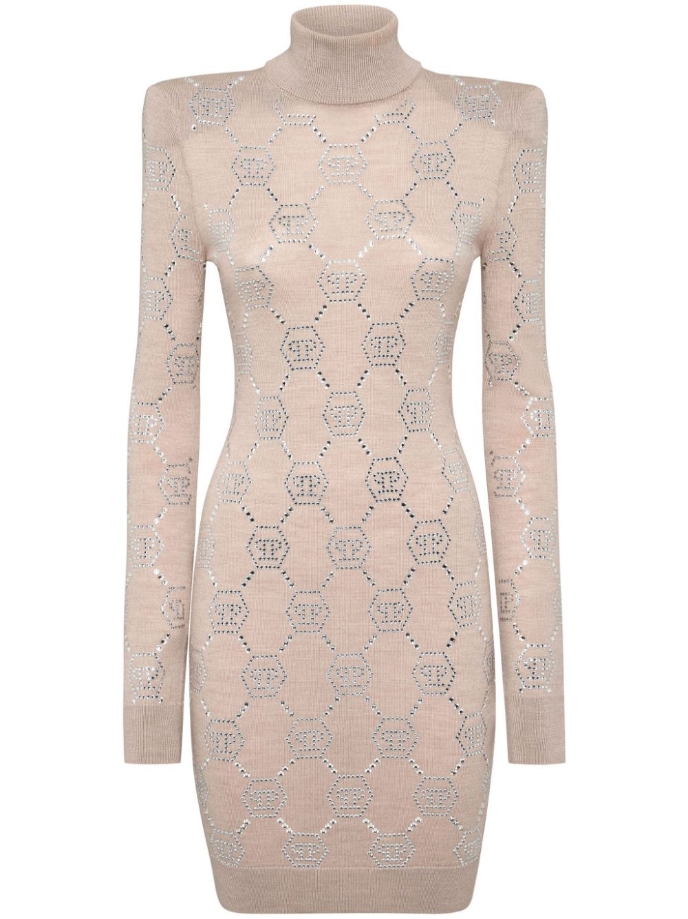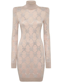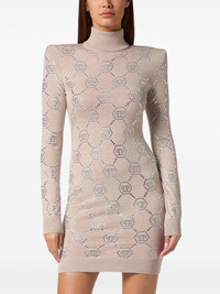 crystal-embellished monogram mini dress Highlights - Beige - Knitted construction - Monogram pattern - Crystal embellishment - High neck - Shoulder pads - Long sleeves - Ribbed trim - Straight hem - Above-knee length Made in Italy Composition Wool 100%