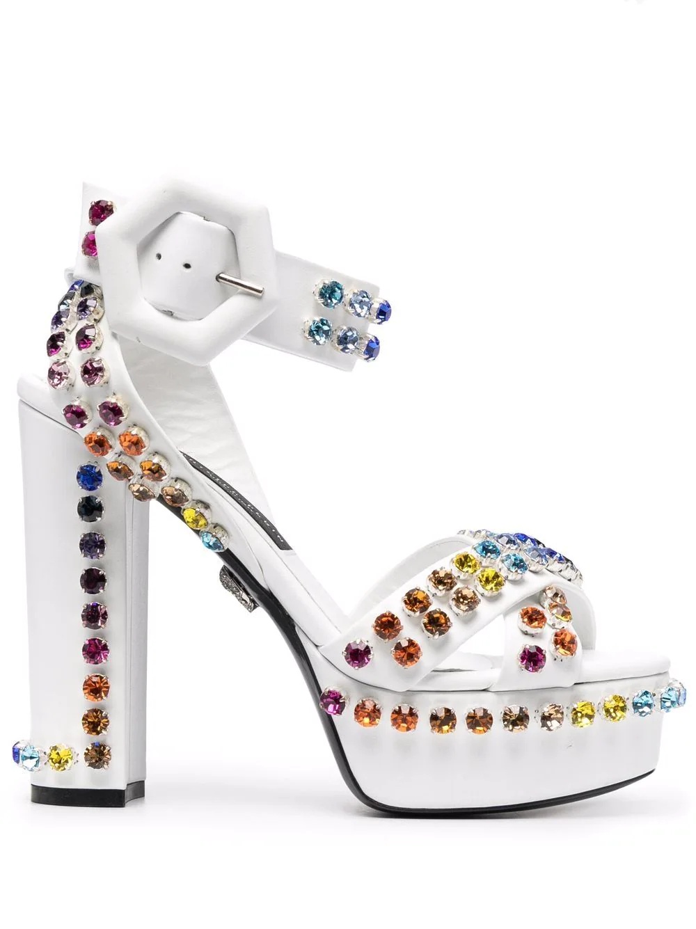 crystal-embellished sandals white leather crystal embellishment buckle-fastening ankle strap open toe branded insole high block heel Made in Italy Composition Outer: Leather 100% Lining: Leather 100% Sole: Leather 100% SIZE & FIT Measurement HEEL 5.15 in(13.1 cm) PLATFORM 1.77 in(4.5 cm)