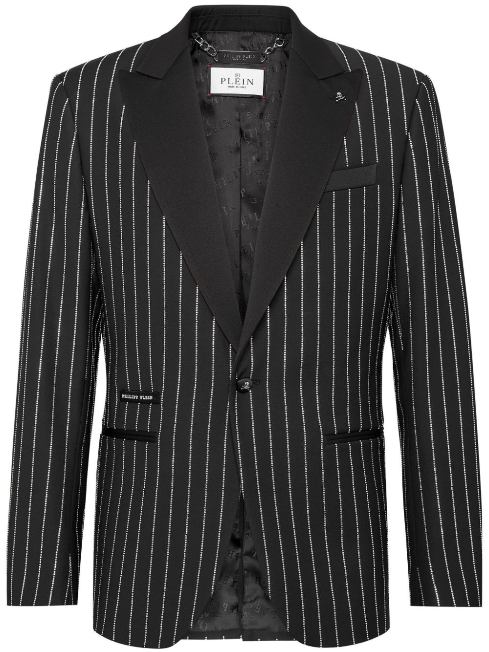 crystal-embellished single-breasted blazer Highlights - Jet black - Vertical stripe pattern - Crystal embellishment - Applique logo - Notched lapels - Front button fastening - Long sleeves - Buttoned cuffs - Jetted chest pocket - Two front welt pockets - Central rear vent Made in Italy Composition Lining: Viscose 51%, Acetate 49% Outer: glass 100%, Polyester 53%, Virgin Wool 43%, Elastane 4%