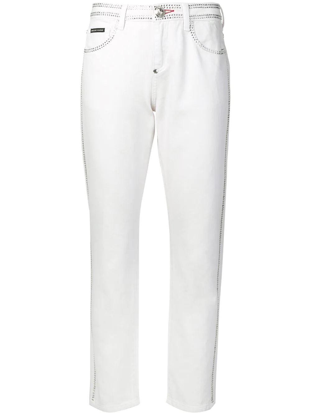 crystal embellished slim-fit jeans Philipp Plein's collection exudes hard-edged decadence with an intricate focus upon detailing. These I got white cotton slim-fit jeans feature crystal embellished trims, a front button fastening, belt loops and a five pocket design. Imported Composition Outer: Cotton 100% Lining: Polyester 65%, Coque Feather 35% SIZE & FIT Model measurements Height 5 ft 11 in(1.8 m) Bust/Chest 31.49 in(80 cm) Hips 35.82 in(91 cm) Waist 24.8 in(63 cm) Washing instructions Hand Wash