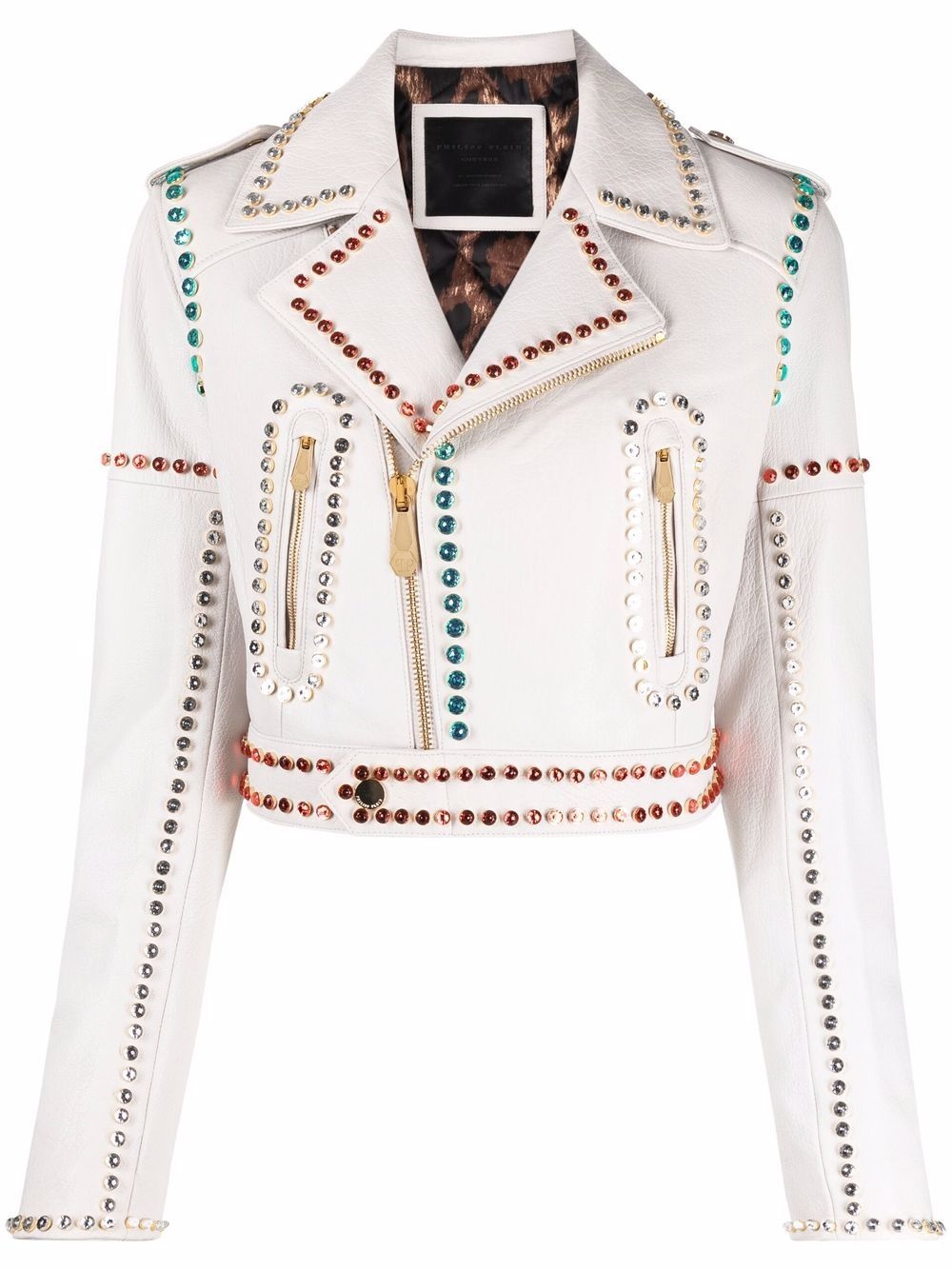 crystal-trim studded cropped biker jacket Staying true to the brands contemporary approach, this cropped biker jacket forms part of Philipp Plein's SS22 collection. Fabricated in white lambskin leather, multicolour crystal embellishments elevate this everyday piece. Imported Composition Outer: Lamb Skin 100% Lining: Polyester 97%, Spandex/Elastane 3% SIZE & FIT Model measurements Height 5 ft 10 in(1.77 m) Bust/Chest 27.95 in(71 cm) Hips 33.85 in(86 cm) Waist 23.22 in(59 cm) FittingInformation This piece fits true to size. We recommend you get your regular size Cut for a loose fit Made with a mid-weight non-stretch fabric Washing instructions Specialist Cleaning
