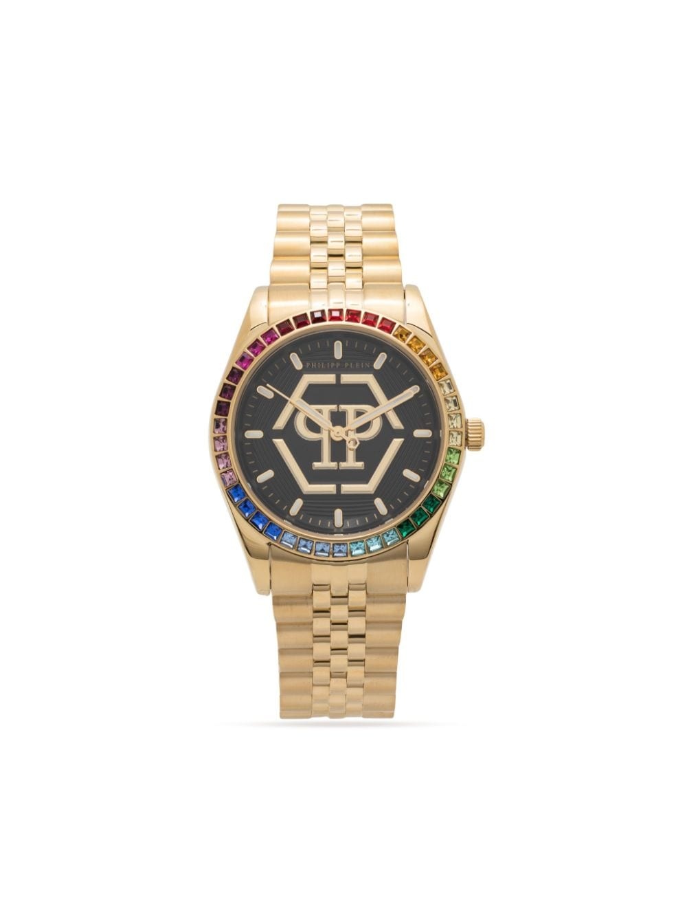 Date Superlative 38mm Philipp Plein's Date Superlative 38mm is a classic model with a pop of colour; the round face is traced with faceted crystals in a spectrum of rainbow hues. It’s crafted from gold-tone stainless steel with a luminescent guilloche dial centred with the brand’s hexagon logo. Highlights - Stainless steel - Gold-tone - Quartz movement - Black - Guilloche dial - Luminescent dial - Baton dial - Baton hands - Round face - Mineral glass - Crystal-encrusted bezel - Screw-down crown - Stainless steel link bracelet - Butterfly clasp fastening - Water resistance up to 50m/5 atm - This item comes with a standard two-year warranty from the brand. Imported SIZE & FIT Model measurements Height 5 ft 10 in(1.78 m) Bust/Chest 33.07 in(84 cm) Hips 36.61 in(93 cm) Waist 24.8 in(63 cm) Measurement CIRCUMFERENCE 0.82 in(2.1 cm) DIAMETER 0.15 in(0.4 cm) Thickness 0.03 in(0.1 cm) WIDTH 0.1 in(0.2 cm)