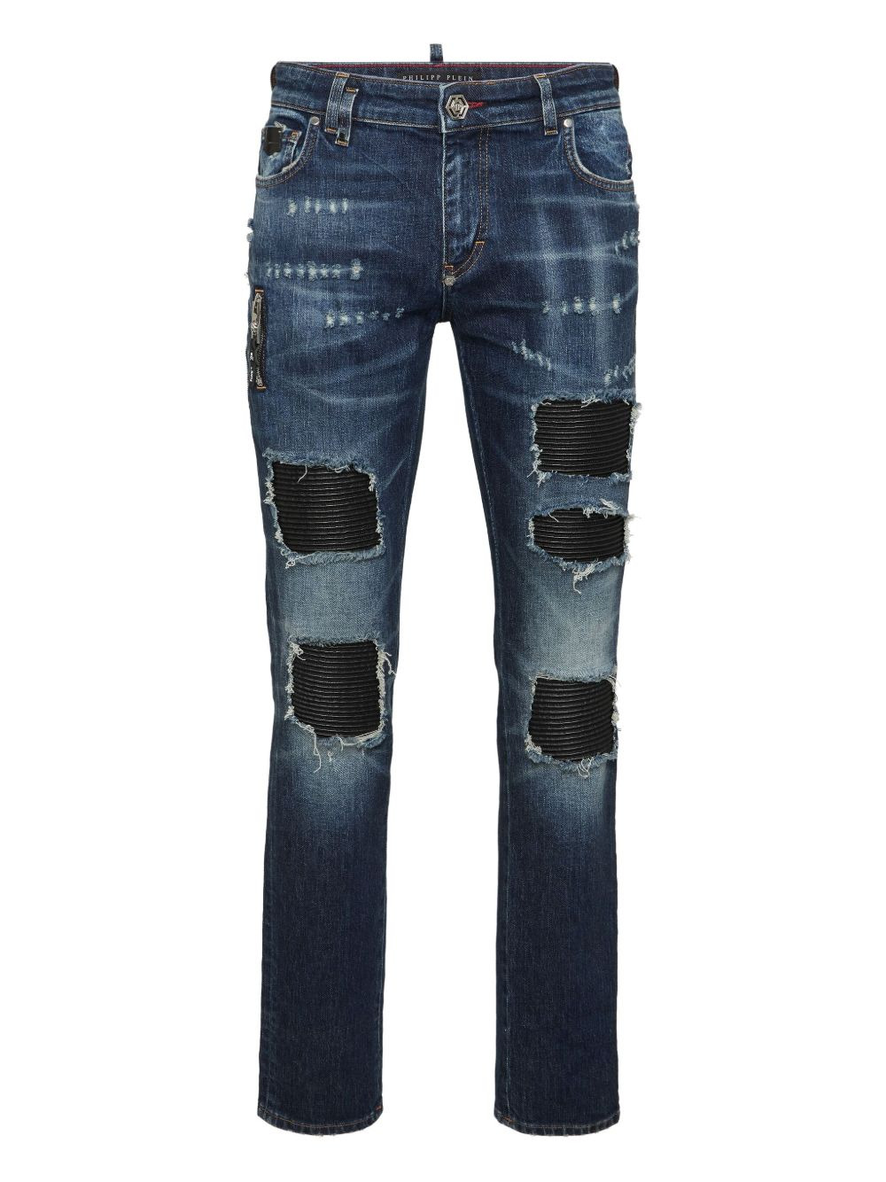 distressed jeans Highlights - Dark blue - Ripped detailing - Five pockets - Belt loops - Branded patch at the back Made in Italy Composition Outer: Cotton 99%, Polyester 50%, Polyurethane 50%, Elastane 1% Lining: Polyester 65%, Cotton 35% Washing instructions Read Manufacturer Guidelines
